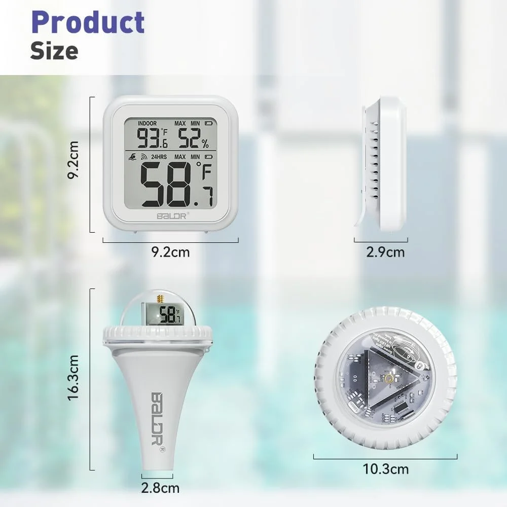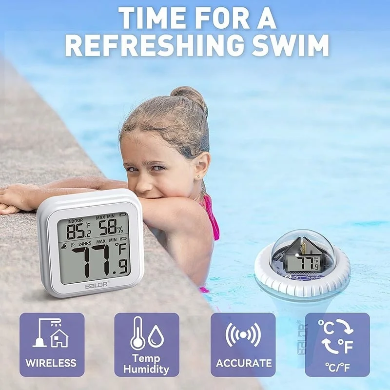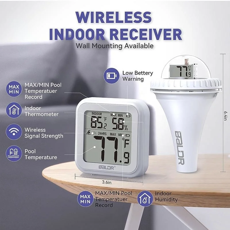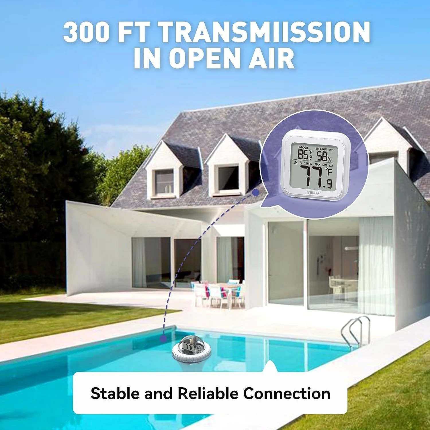 πWireless Pool Thermometer: The maximum connection distance is 300 feet(90M). You can check temperature readings with the receiver inside home.