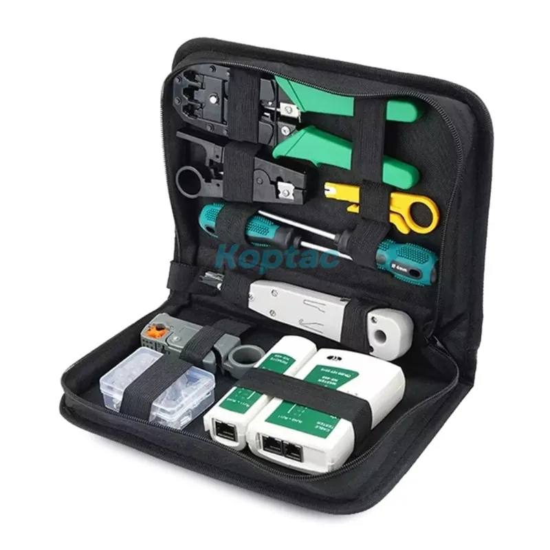 The includes Cat6 RJ45 pass through connectors and protections boot, along with a Networking cable tester, wire and cutter, all neatly packed in a cloth bag for portability.